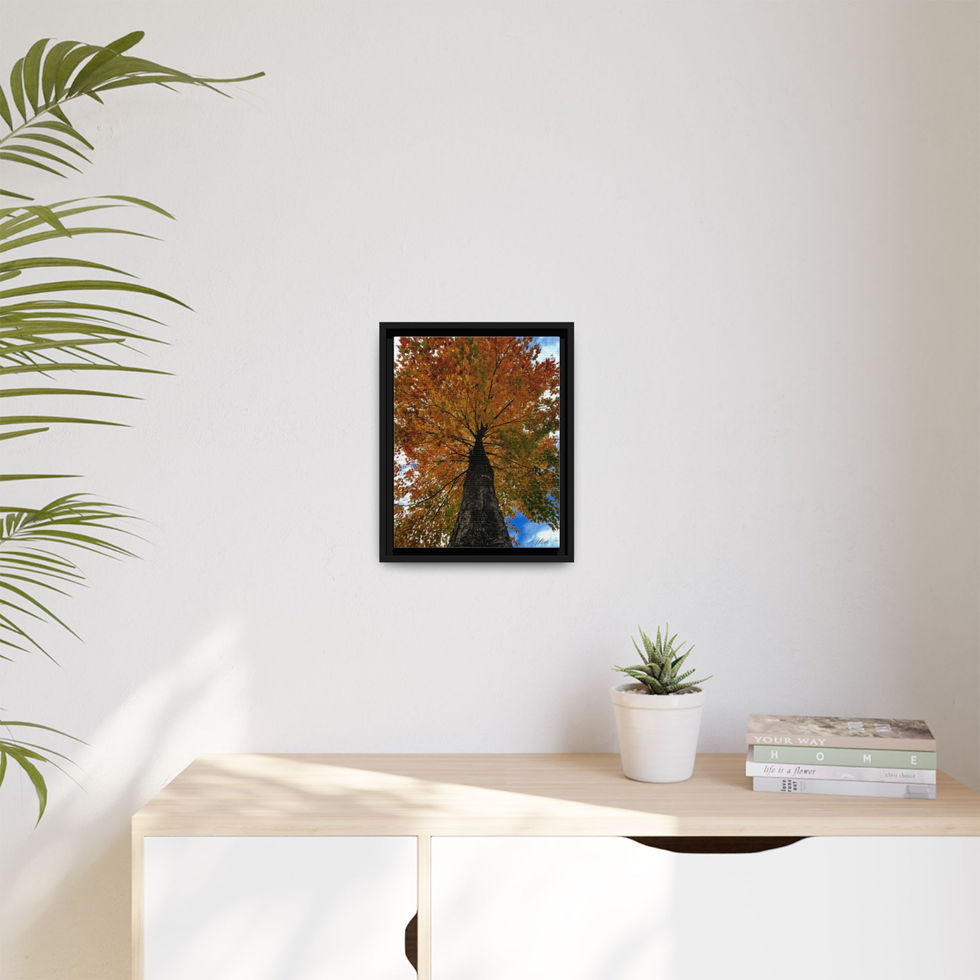 A framed matte canvas print that brings the hush of the forest into your home. Shot from the base of a towering tree, the image pulls your gaze upward through a riot of autumn leaves toward a patch of blue sky. The deep blacks of the trunk and the warm, saturated oranges and reds are rendered with UL-certified Greenguard Gold latex inks on a durable cotton-poly canvas composite. The print is stretched over sustainably sourced pine and finished with a clean matte black frame and sawtooth hanging hardware—ready to hang and steady in any room that celebrates nature and seasonal change.