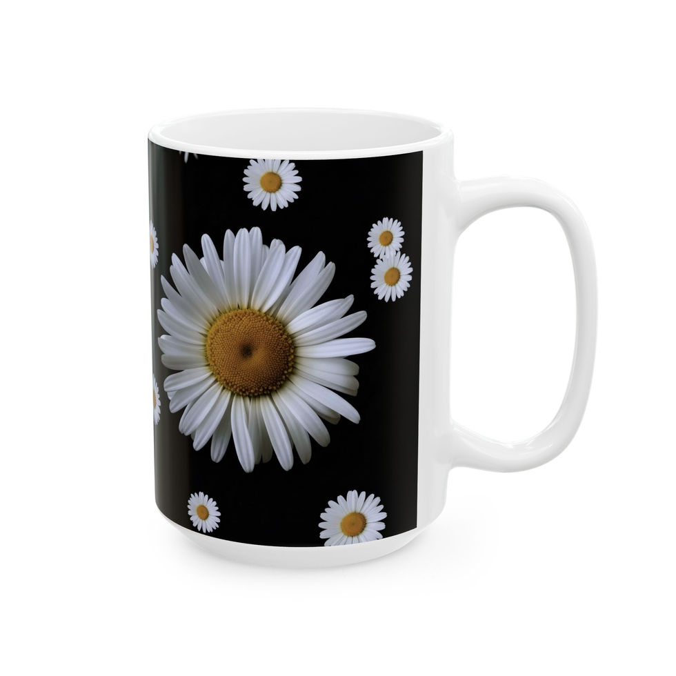Sip slowly and let a field of daisies brighten your morning. This glossy ceramic mug wraps a bold black background with crisp white petals and warm golden centers, creating a striking contrast that feels both modern and tender. The smooth C-handle sits comfortably in your hand while the vibrant print keeps its clarity through daily use. It’s the kind of mug you reach for when you want a quiet, sunny moment with coffee, tea, or cocoa — a small ritual that makes the day feel grounded and calm.