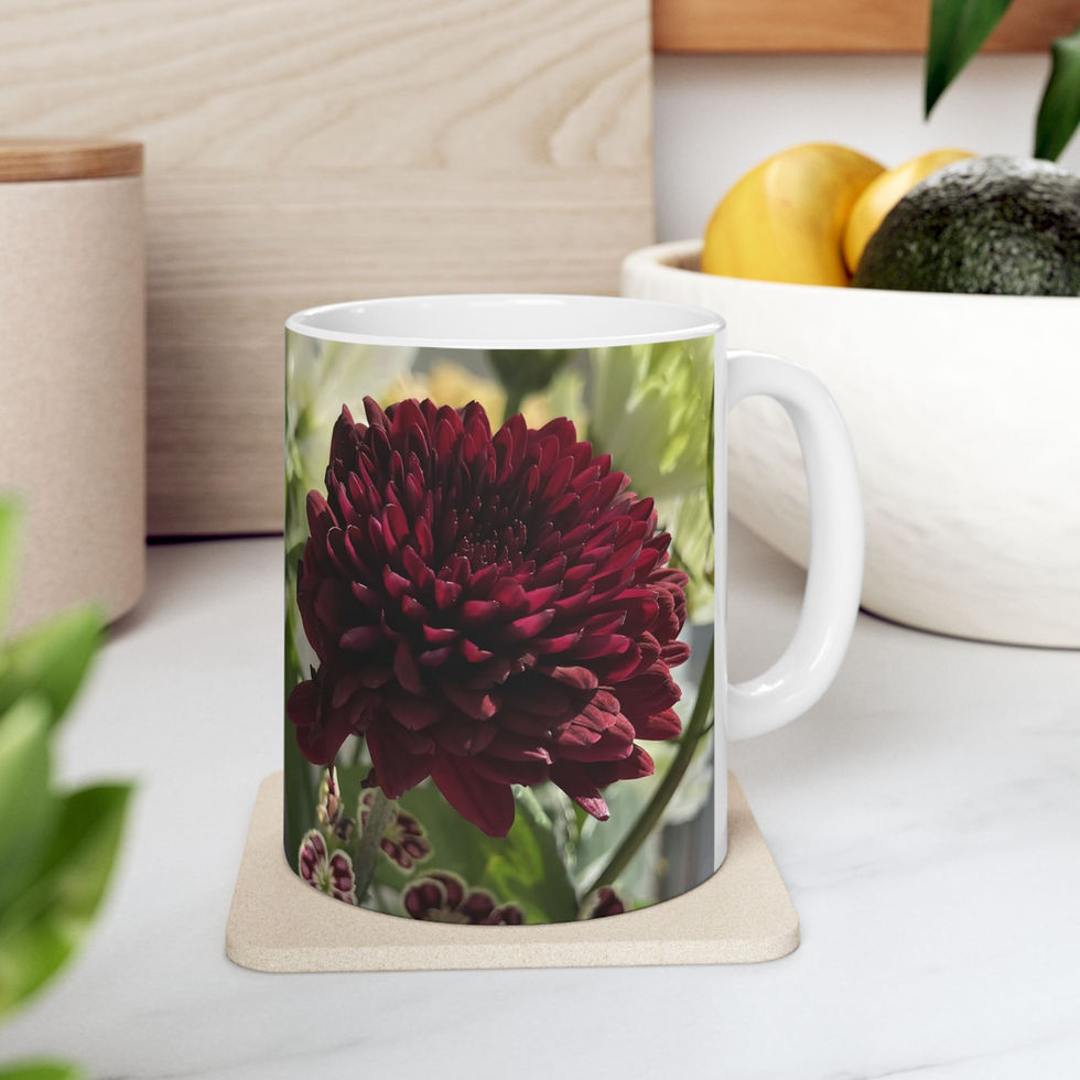 Warmth in your hands and a quiet moment in the garden. This glossy ceramic mug wraps a mirrored floral scene — deep burgundy blooms and soft green foliage — around its curve. It feels like slow sunlight on a windowsill, a pause between tasks, a private sip of tea or coffee while you plan your day. The rich, true-to-life colors hold their depth through washes and microwaves, so the image stays vivid as the mug becomes part of everyday ritual. It’s an object that looks at home on a cozy breakfast table, on a desk beside a notebook, or tucked into a kitchen shelf as a familiar, calming presence.
