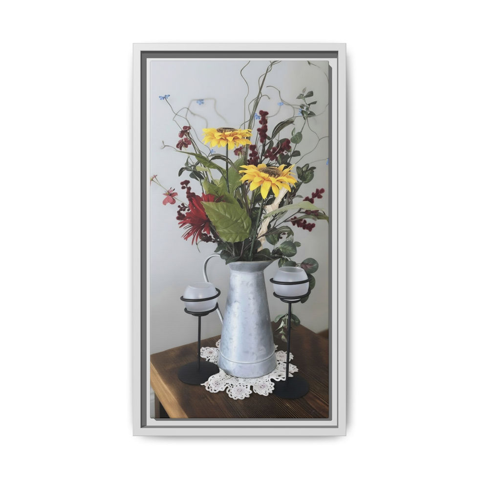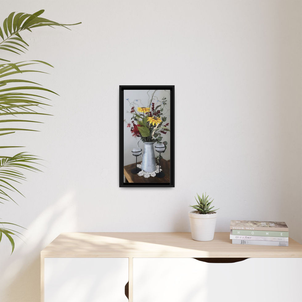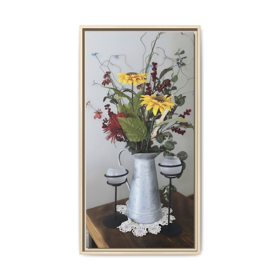A framed matte canvas print that brings quiet, country charm into any room. The artwork — a simple bouquet in a rustic metal pitcher — reads like a captured moment from a farmhouse kitchen window: sun-softened yellows, warm reds, and long, wandering stems. The thin pine frame and muted matte finish keep reflections low and let the texture of the canvas and brushwork speak. Hang it vertically in a hallway, over a side table, or beside a gallery of family photos to add a gentle, lived-in warmth that feels like home.