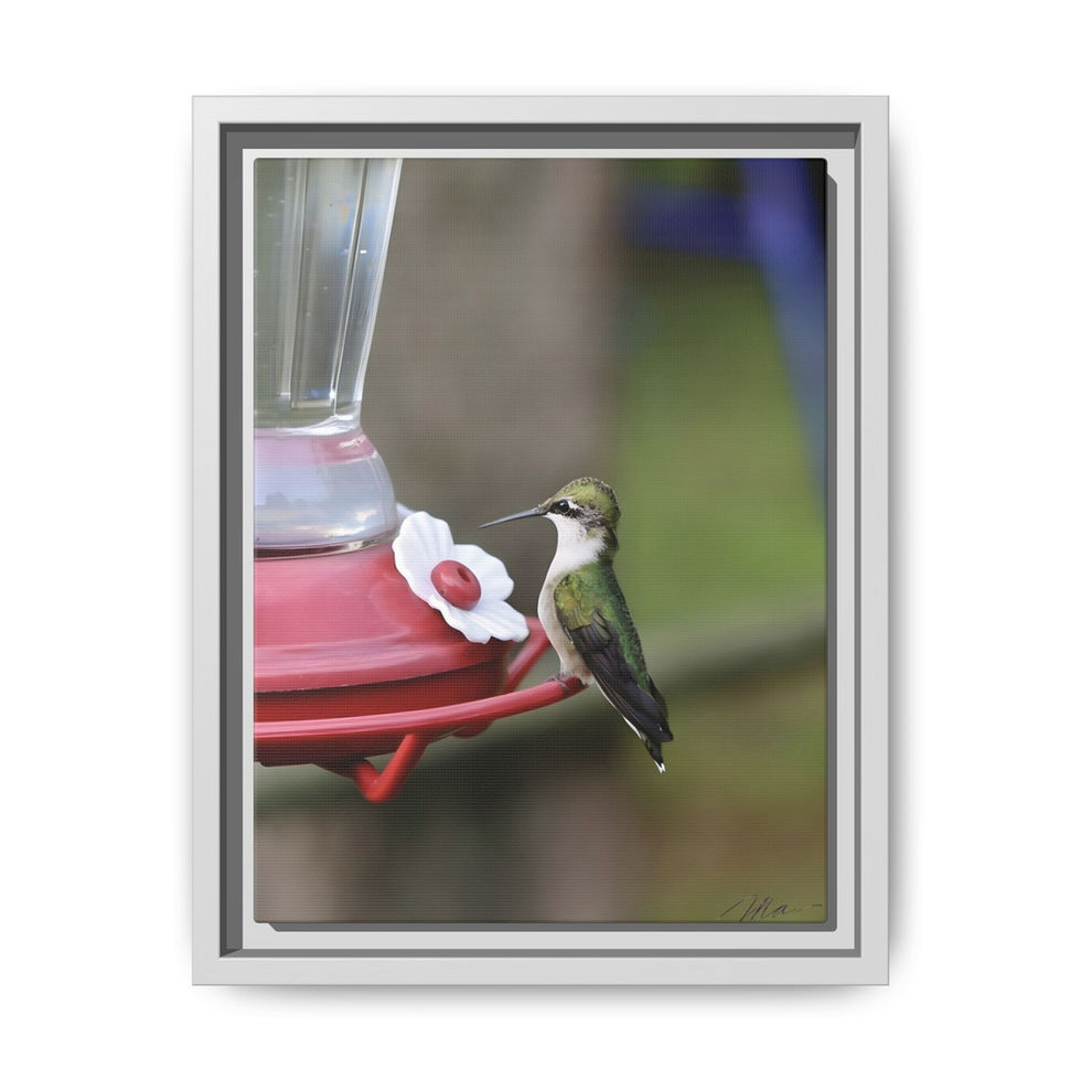 A framed matte canvas print that brings a quiet garden moment indoors. Soft-focus photography captures a ruby-throated hummingbird pausing at a feeder, its iridescent greens and subtle highlights rendered with vivid, fade-resistant inks. The slim pine frame and multi-color matte complement the image, giving it a refined gallery look while keeping the scene feeling intimate and alive. Hang it by the sawtooth hardware in a sunroom, kitchen nook, or hallway to recall slow summer mornings and the hush of backyard wildlife.