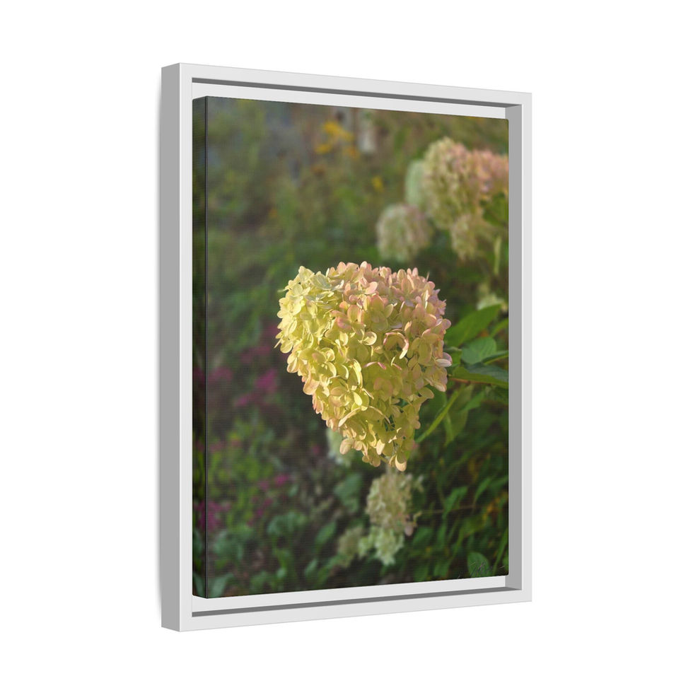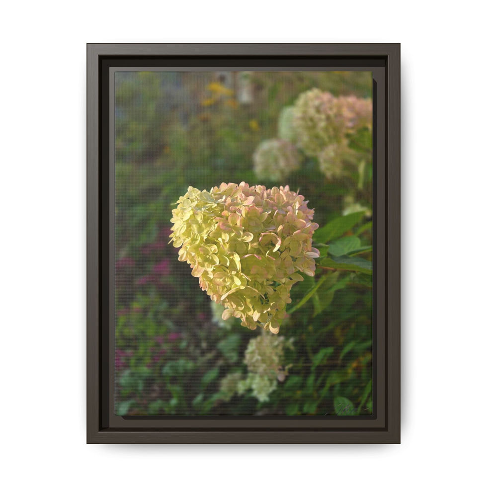 Warm, quiet, and intimately botanical — this framed matte canvas carries the soft glow of late-summer hydrangeas captured in natural light. The subtle, painterly texture of the coated canvas and the deep black pine frame give the image a tactile calm that settles into cozy corners. Hang it where morning light spills across a reading nook, or lean it on a mantel to bring a gentle, garden-fresh mood indoors. The muted pastels and rich greens read as both peaceful and thoughtfully composed, inviting slow moments and quiet reflection.
