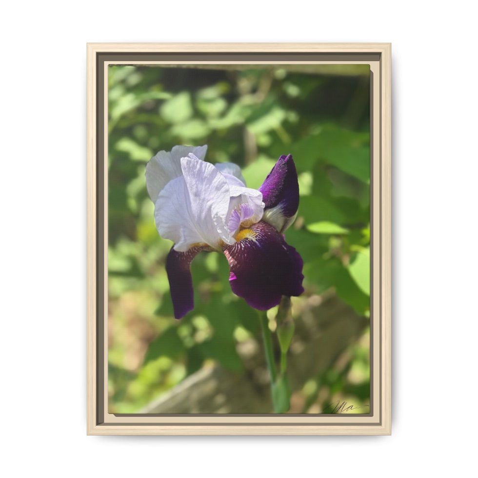 A framed matte canvas print that brings a quiet, garden-moment into your home. Soft natural light and rich purples from the iris bloom sit against a blurred green backdrop, captured with vibrant detail on a cotton-poly canvas treated with a proprietary coating. The print is stretched over a responsibly sourced pine frame with clean lines and a contemporary matte finish, ready to hang with included sawtooth hardware. It feels like a slow afternoon in a backyard patch of flowers — calm, attentive, tender — and slips easily into living rooms, sunrooms, or a hallway where small moments can be noticed again and again.
