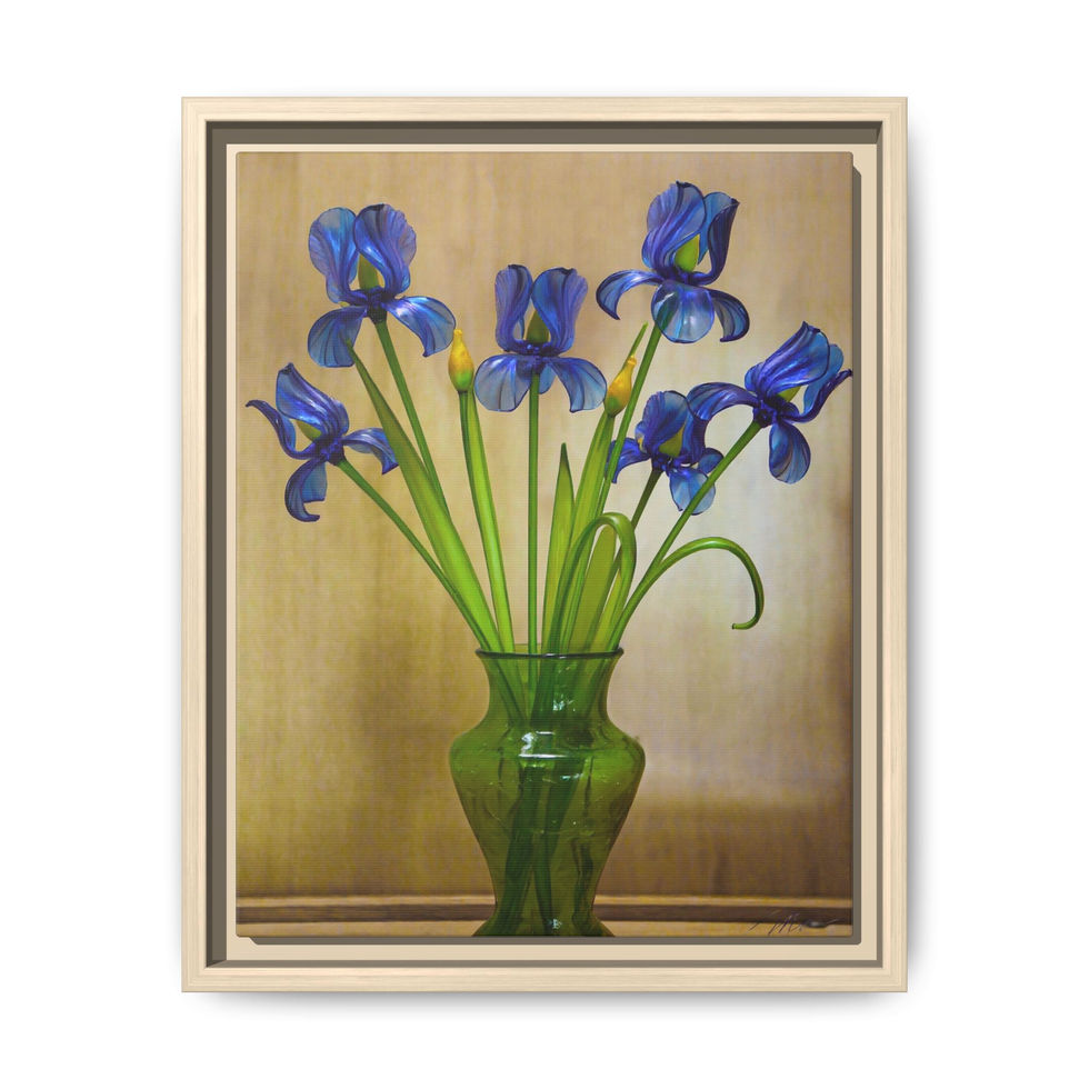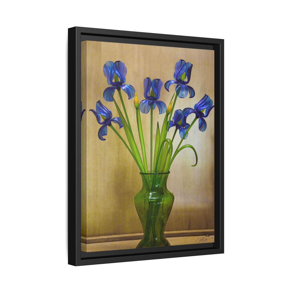 Bright, painterly irises rise from a translucent green vase against a warm, muted background. Printed on a matte canvas with a refined coated finish, the image holds rich blues and verdant greens that pop from the soft, natural tones behind them. Framed in a slim pine profile, the piece reads like a quiet study in still life—calm, confident, and quietly elegant. It brings the serenity of a sunlit windowsill into kitchens, reading nooks, or entry halls, and sits comfortably with both modern and cottage-inspired interiors.
