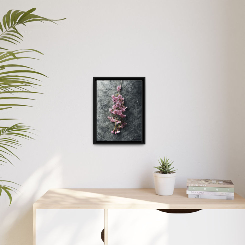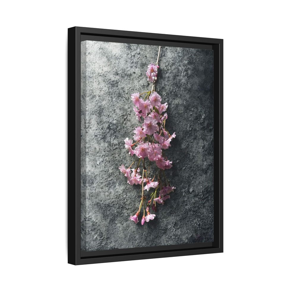 A framed matte canvas print that brings quiet, contemplative beauty into living spaces. Soft pink blossoms hang against a textured gray backdrop, rendered in vivid, true-to-life color on a cotton-poly canvas with a refined proprietary coating. The slender black pine frame gives the piece a modern, gallery-style presence while keeping an intimate, tactile feel. It hangs easily with sawtooth hardware and is available in multiple orientations and sizes to suit entryways, bedrooms, or calming corners of a home or studio.