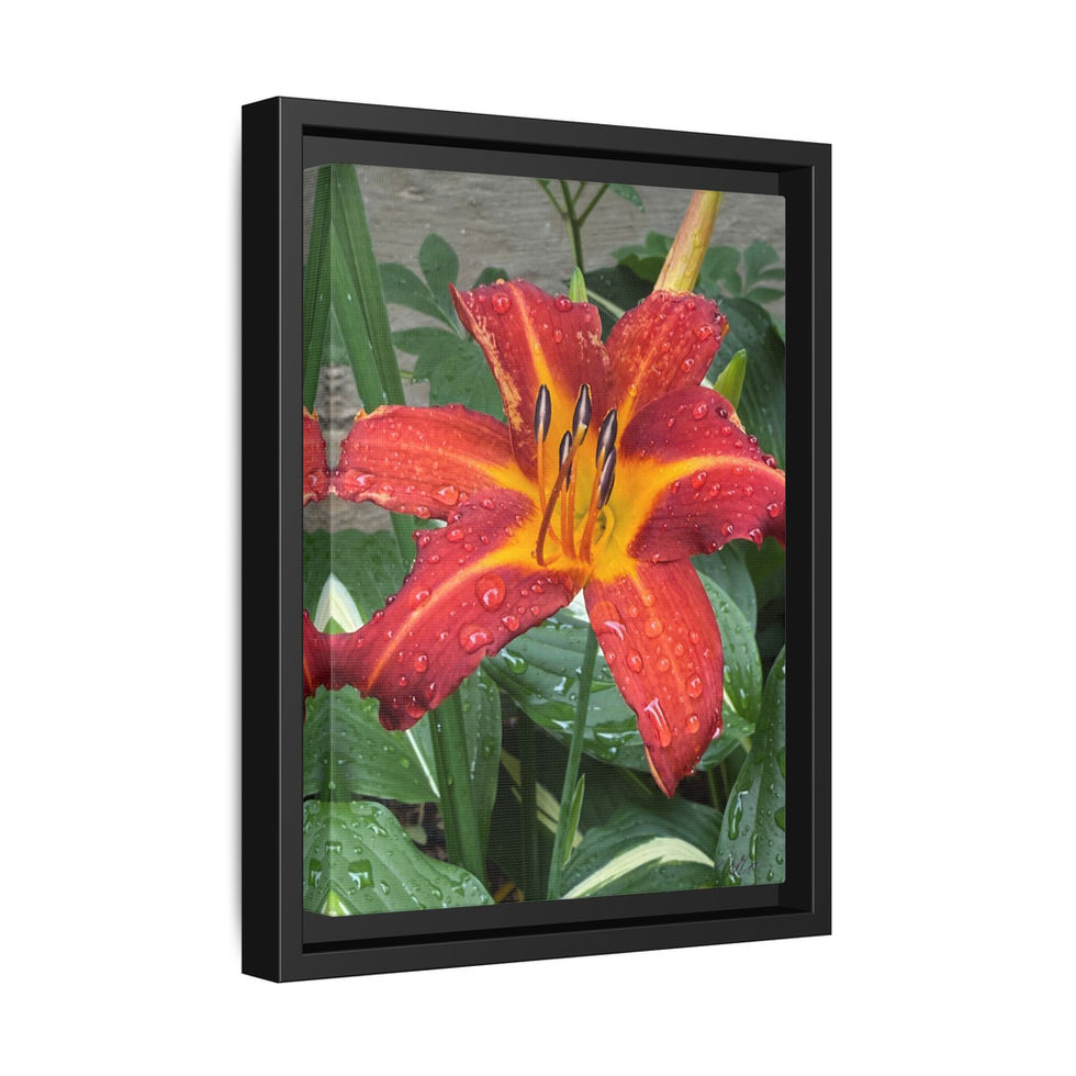 A vibrant matte canvas print framed in sleek pine, this piece captures a drenched summer day—an orange-red daylily layered with glistening raindrops and lush green foliage. The matte finish softens glare while keeping color depth rich and velvety, so the flower’s warm center and crimson petals hold their presence on the wall. Lightweight but sturdy, the pine frame adds clean lines and a modern silhouette that blends with rustic interiors or contemporary galleries. Hang it vertically in an entryway to welcome guests with a flash of summer, place it above a bedside table to bring garden calm to mornings, or pair it with other botanical prints for a collected, lived-in wall arrangement.