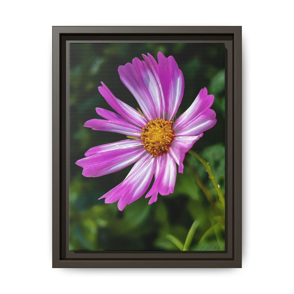 A matte canvas print framed in sustainably sourced pine, featuring a close-up photograph of a pink cosmos flower against a soft, green bokeh background. The image’s vibrant magenta petals and warm yellow center pop on the finely coated cotton-poly canvas, while the deep matte finish eliminates glare and keeps colors rich and true. Hung with sawtooth hardware, this framed canvas brings a quiet, botanical energy to entryways, sunrooms, or layered gallery walls. It reads like a captured morning — light, delicate, and alive — making any nook feel intentionally tended and quietly joyful.