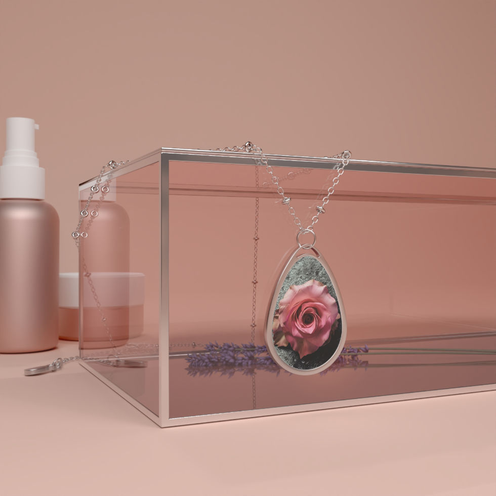 This ellipse pendant necklace holds a small, luminous moment close to the chest. The glossy, full-color print sits on a white aluminum surface, keeping photographic detail and bright hues crisp — like a single rose caught in soft focus. The teardrop-like shape drifts against a delicate chain with tiny bead accents, and a secure lobster clasp keeps it steady through daily life. Wear it as a quiet reminder of a person, place, or memory you carry with you; it reads like a small, wearable keepsake that layers easily with other pieces.