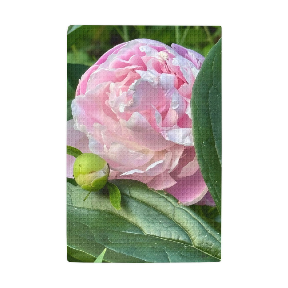 Soft visual poetry for your kitchen. This waffle-weave hand towel showcases a close-up pink peony bloom set against deep green leaves, printed on a textured lattice that softens light and adds depth. It drapes well across counters or hooks, catching small spills and drying hands with a textured surface that feels substantial but gentle. The floral image evokes a quiet morning in a garden — slow coffee, damp soil, and the hush after rain — bringing that calm into everyday chores.