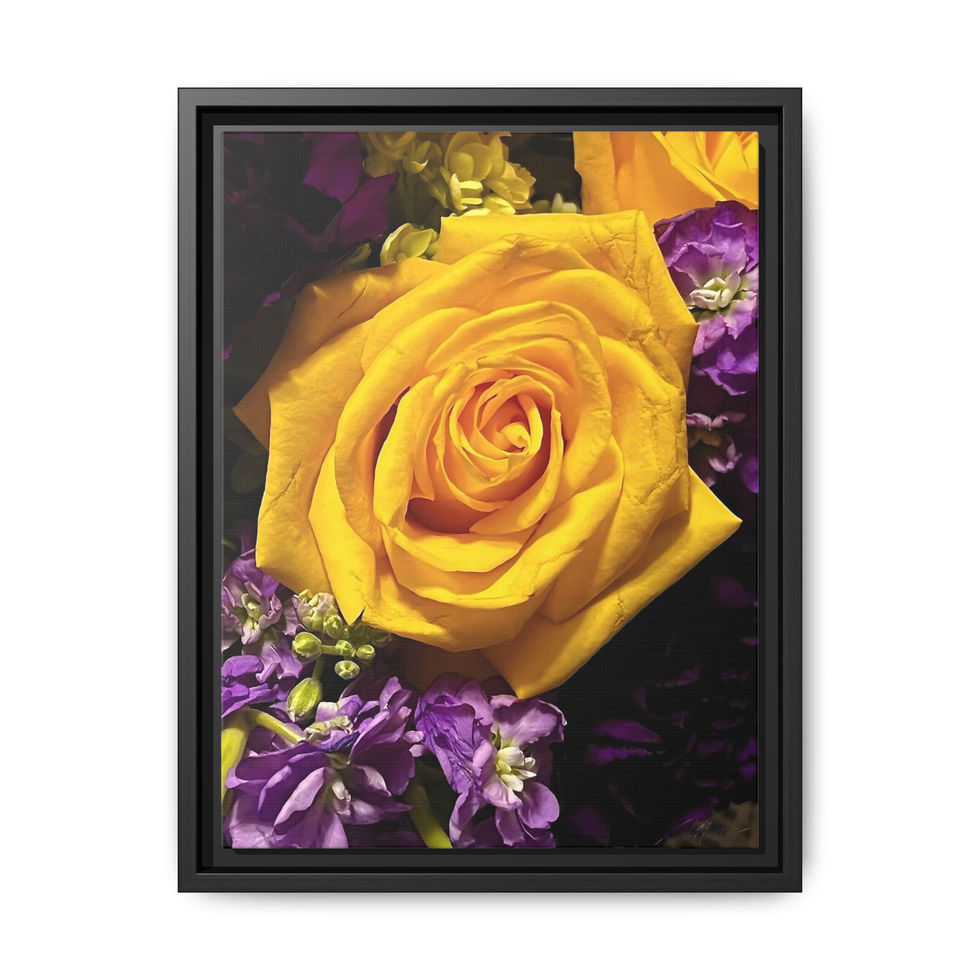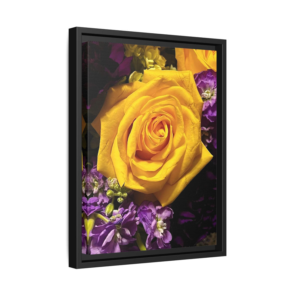 A framed matte canvas print that brings a single, luminous yellow rose into the room with bold, jewel-toned contrast. The deep blacks and vivid purples around the bloom make the rose feel both intimate and dramatic—like a quiet moment plucked from a florist’s late-night studio. Hung in a hallway, beside a bedside, or above a console, the print reads as both thoughtful décor and a focused study in color and texture. The slim pine frame and matte finish keep reflections low and let the image’s rich tones sit quietly in any curated space.